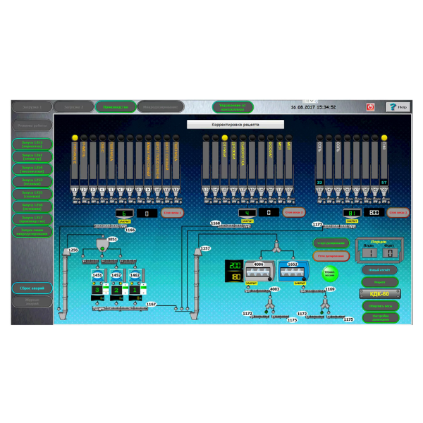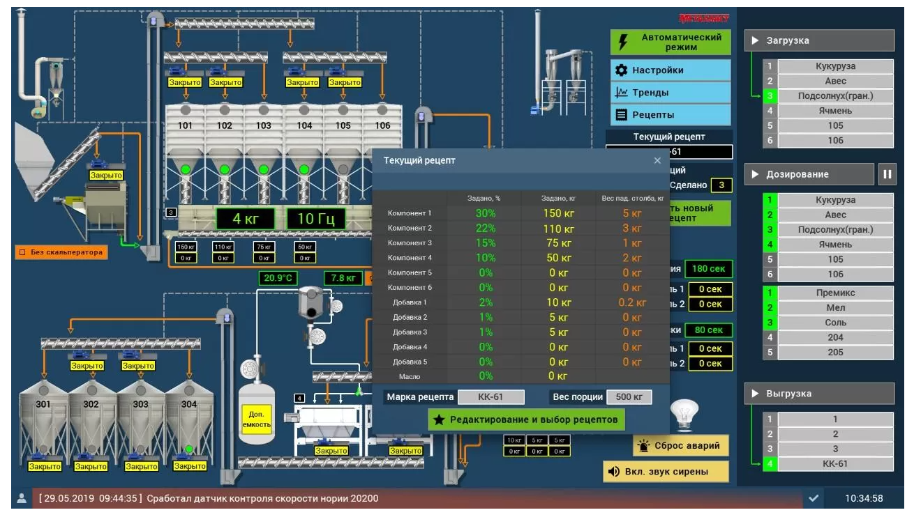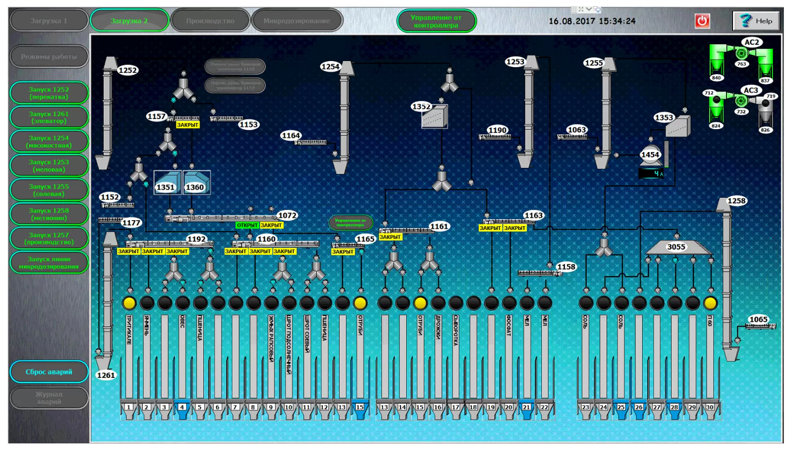 Система управления предназначена для автоматизации производства комбикормов с управлением и диагностикой неисправностей технологического оборудования, визуализацией технологического процесса, архивированием информации, распечаткой архивных данных и рецептур.