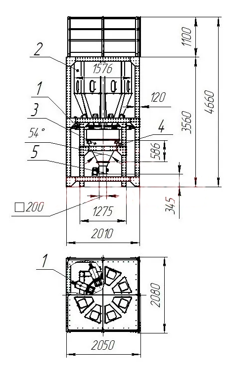 Дозирование компонентов в КМД 8-1-50 осуществляется посредством последовательного срабатывания пневматических задвижек (1), подающих компоненты из восьми загрузочных бункеров (2) в бункер весовой (3), установленный на трех тензодатчиках (4). Различные дозы компонентов накапливаются в весовом бункере. Электрический сигнал от датчиков определяет количество (массу) компонентов. Быстрая разгрузка порции компонентов осуществляется шлюзовым затвором (5).
