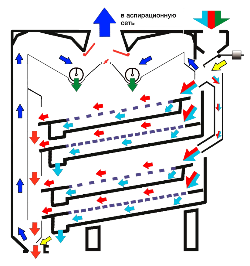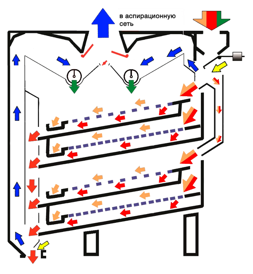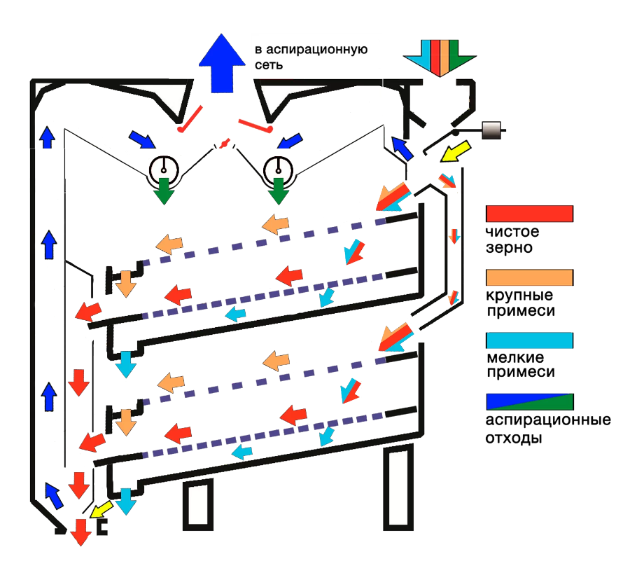Основной продукт идет сходом подсевного решета и попадает в канал главного пневмосепаратора, в котором продукт вторично продувается воздухом, и из него выделяются щуплые, битые зерна, легкие и другие примеси отличающиеся от основного зерна аэродинамическими свойствами.