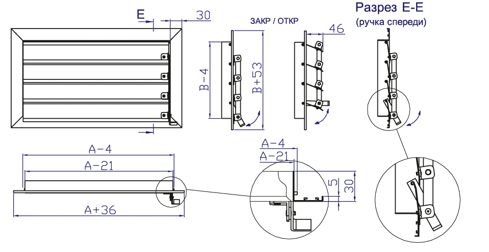 Решетка выполнена с рамой из уголка 30×30 мм и оснащена горизонтальными подвижными жалюзи, которые управляются вручную с помощью ручки. По умолчанию ручка расположена на лицевой стороне конструкции, при необходимости возможна установка с задней стороны.