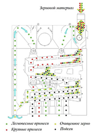Загрузочное устройство равномерно распределяет зерновой материал по всей ширине сепаратора и направляет для очистки от легковесных примесей в предварительный пневмосепаратор. Далее зерно поступает в модуль решетный, где происходит разделение зернового материала по геометрическим параметрам: на верхних решетах выделяют крупные примеси, а на нижних — подсев