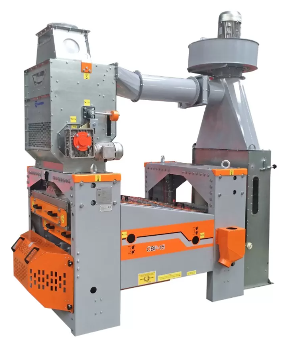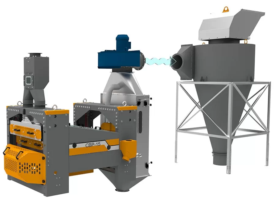 Очистка ситовых сегментов решет выполняется резиновыми шариками. Зерновой материал, прошедший очистку на решетном модуле, поступает в блок пневмосепарирующий. Питатель равномерно подает зерно в пневмоканал, где происходит выделение легковесных примесей, которые уносятся в осадочную камеру и далее винтовым конвейером выводятся за пределы машины.