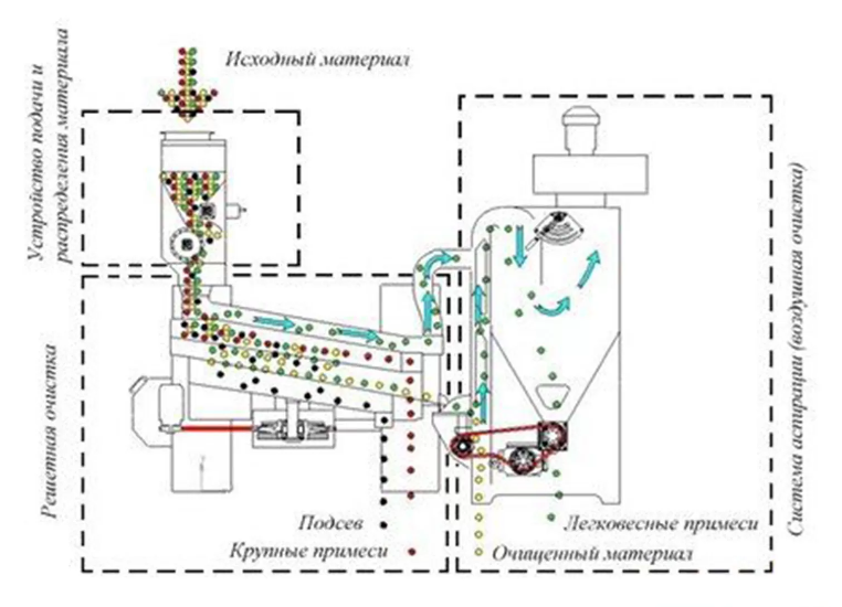 Зерновой материал подается в бункер-питатель и дозирующим механизмом равномерно распределяется по ширине решетного модуля, кузова которого совершают круговые колебания, при этом верхнее решето отделяет крупные примеси, а нижнее – подсев.