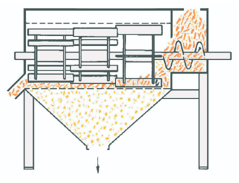 Обрабатываемый материал с помощью шнека подается внутрь неподвижной корзины-барабана, выполненной из плетеной сетки. Внутри корзины-барабана вращается вал-ротор со специальными лопастями, выполненными в виде щёток.
