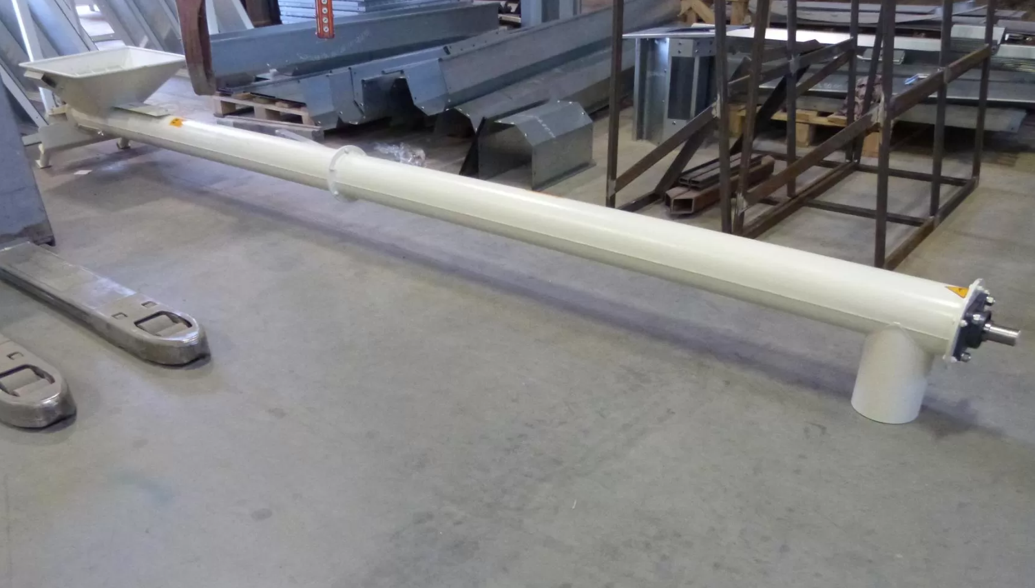 Шнек состоит из желоба, выполненного в виде трубы, либо имеющего форму полуцилиндра, прикрытого сверху крышкой.