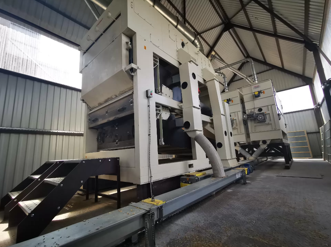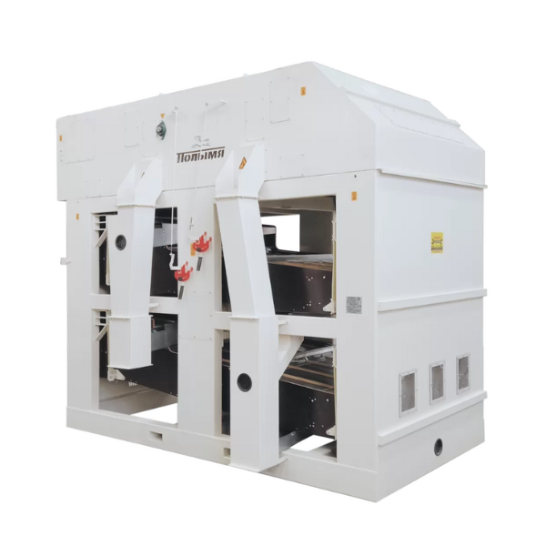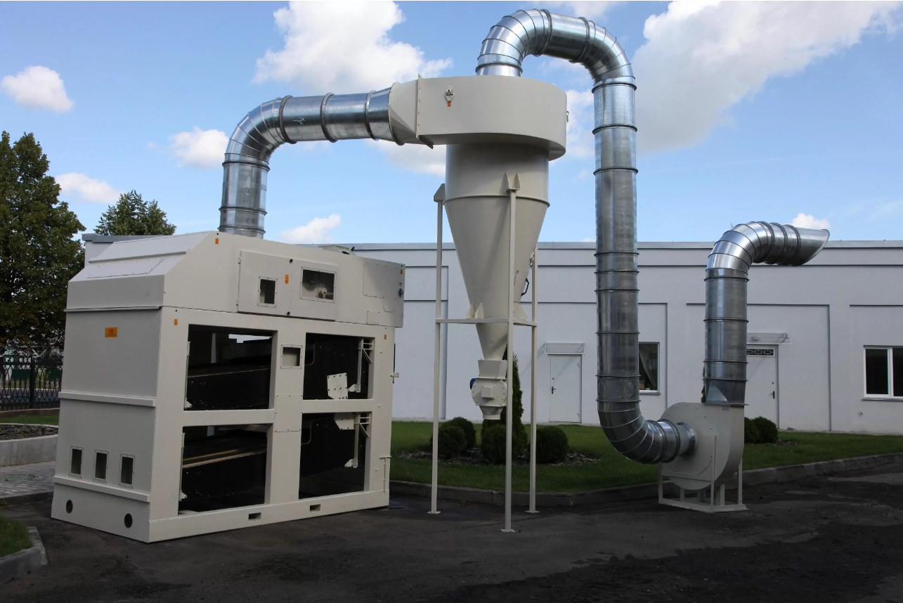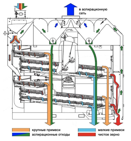 Очищаемый продукт подается в приемный бункер, откуда, преодолевая сопротивление питающей заслонки, равномерным слоем попадает в аспирационную камеру, где удаляются легковесные примеси (пыль, шелуха и тд), оседающие в осадочной камере. Воздушный поток в системе аспирации регулируется под каждую культуру.