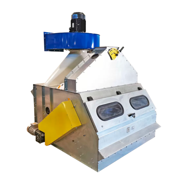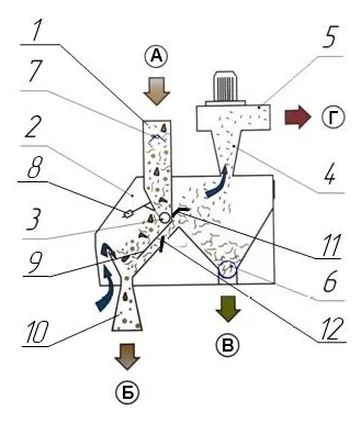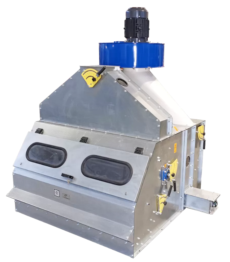 Культура подается в приемный лоток (1), выполняющий функцию накопительного бункера, в основании которого расположен распределительный барабан (3). Вращаясь барабан формирует равномерный слой культуры, толщина которого регулируется положением грузов на заслонке (8). Продукт движется по склизу (9) и падает в выходной лоток чистого продукта (10). Под склизом (9) расположен воздушный канал, связанный с вентиляторной камерой, в который засасывается пыль и легкие примеси из падающего слоя культуры. Сила всасывания в воздушном канале регулируется заслонкой подсоса (12). На выходе воздушного канала в вентиляторную камеру установлена регулируемая заслонка (11), которая препятствует попаданию легких примесей в вентилятор (5). Легкие примеси опадают на дне вентиляторной камеры и, шнеком (6), выводятся в выходной лоток. Пыль подается вентилятором в циклон-пылеотделитель.